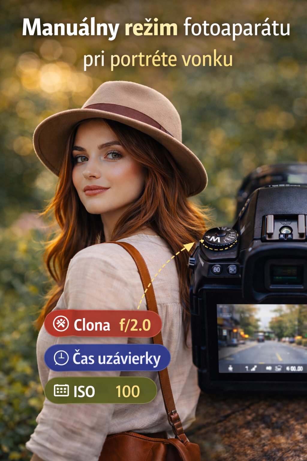 Tu sa manuálny režim konečne prestáva tváriť ako teória a začne fungovať v praxi. Keď fotíš portrét, cieľ býva zvyčajne jasný: chceš mať ostré oči, príjemné svetlo a pozadie, ktoré neruší. To znamená, že priorita býva často clona. Začneš teda tým, že si nastavíš napríklad otvorenejšiu clonu, potom skontroluješ čas uzávierky a až nakoniec doladíš ISO. Pri portréte vonku je tento systém veľmi prirodzený a rýchly, pretože pohyb býva menší problém než vzhľad pozadia.