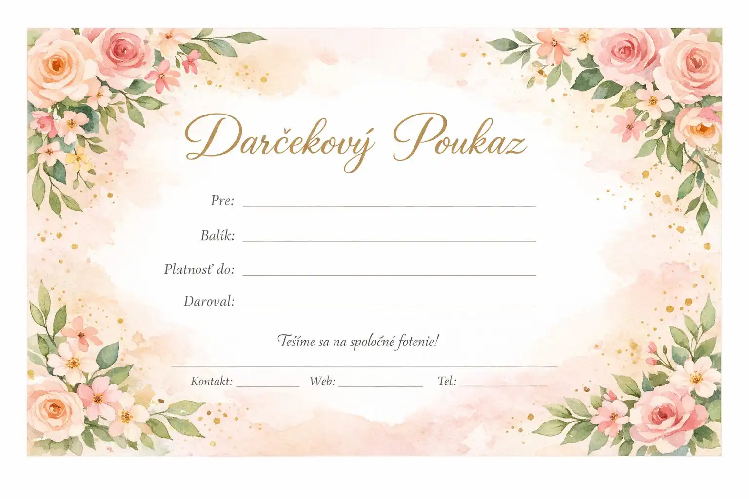 - Platnosť a podmienky – jasne stanov, do kedy je poukaz platný a čo všetko zahŕňa (cestovné náklady, počet fotiek, miesto fotenia).